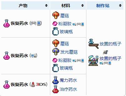1.泰拉瑞亞恢復藥水PC端做法為玩家在放置的瓶子或煉藥桌處,使用材料蘑菇、發光蘑菇、玻璃瓶和粉凝膠(主機和手機版則不需要發光蘑菇即可製作)。