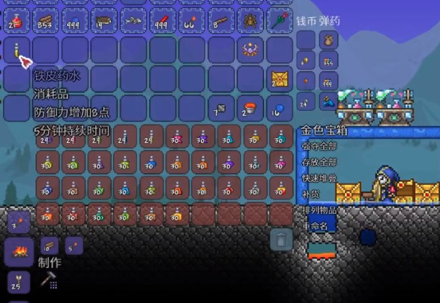 首頁 泰拉瑞亞 問答 泰拉瑞亞鐵皮藥水配方怎麼做? 2022-10-20 1、打開運行遊戲,製作一個工作台做準備。2、鐵皮葯劑合成需要的材料有水瓶(當玩家位於水中時,可以用空瓶直接製作獲得,太陽花(生長於森林草地的地表),鐵礦或鉛礦。3、在工作台上,點擊準備的材料,合成即可獲得鐵皮葯劑。