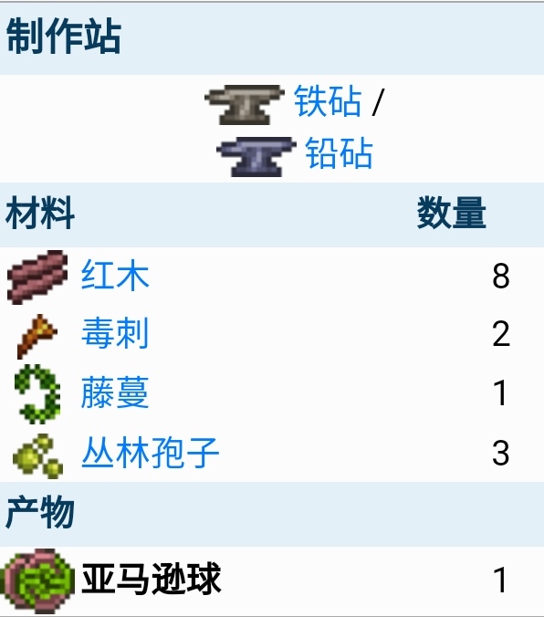 在泰拉瑞亞這款遊戲中,玩家可以使用一根藤蔓、兩根蜂刺、三顆孢子和八塊紅木在鐵砧處製作獲得亞馬遜球,它的最佳附魔是超神。