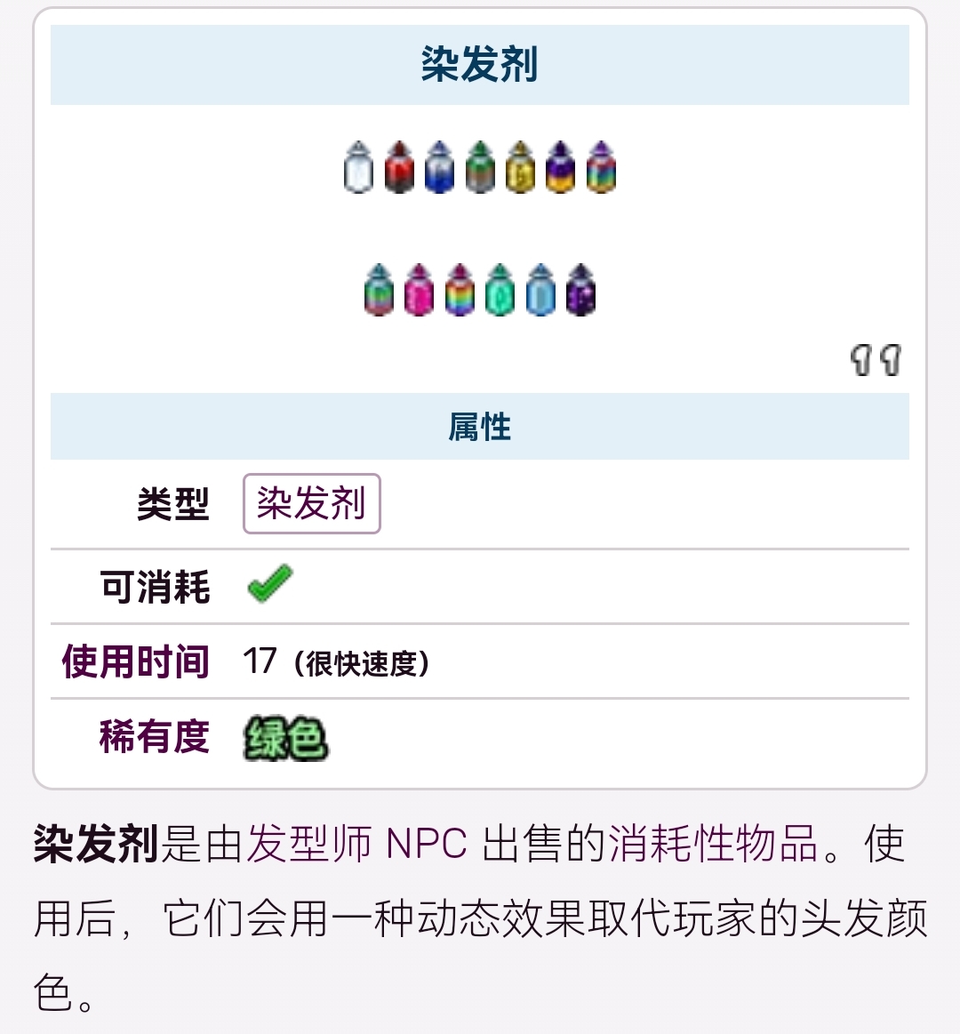 首頁 泰拉瑞亞 問答 泰拉瑞亞染髮劑有什麼用? 2022-10-20 染髮劑是由髮型師 NPC 出售的消耗性物品。使用後,它們會用一種動態效果取代玩家的頭發顏色。簡單來說就是使用染髮劑後,它會隨著某種條件的變化而改變頭發顏色。