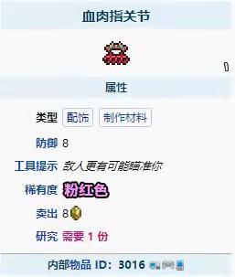 在遊戲《泰拉瑞亞》中,血肉指關節屬於困難模式的配飾類物品,將猩紅寶箱怪殺死有20%概率獲得,多打幾次就可以獲得。