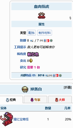 血肉指虎是掉落於困難模式的猩紅寶箱怪,它能夠增加怪物對於玩家的仇恨,提高八點的防禦力,在飾品當中也只能算作是一般。