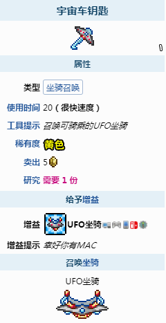 2、宇宙車鑰匙,使用時它會召喚一個可騎乘的UFO坐騎,可以無限地飛行與懸停於空中,缺點就是沒有辦法下水。