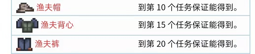首頁 泰拉瑞亞 問答 泰拉瑞亞漁夫套裝怎麼獲得? 2022-10-22 漁夫套裝獲得方法:在遊戲《泰拉瑞亞》中,漁夫套裝是由帽子、背心和褲子構成,每個部件可以提供5%的釣魚力加成,通過漁夫的第10個任務、第15個任務、第20個任務分別獲得。