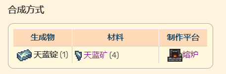 在遊戲泰拉瑞亞災厄Mod中,天藍錠是用於製作天空主題的物品,困難模式前可製作獲得,使用4個天藍礦在熔爐處即可合成。