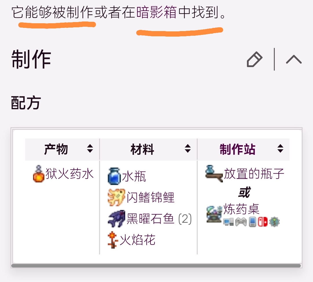 獄火葯水有兩種獲得方式,一是自己製作的,二是在地獄當中開暗影寶箱獲得。獄火葯水是種在喝下後會給予獄火增益的增益葯水,這會施放一圈環形火焰,能夠在接觸到一些敵怪時造成低傷害和著火了!減益,並且會發光。不會對小動物和其他被動 NPC 造成傷害。