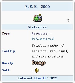 《泰拉瑞亞》殺怪計數器屬於信息類配飾物品,能夠展示玩家所擊殺的敵人的數量,是合成飾品REK3000的配件之一。