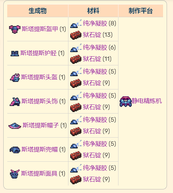 首頁 泰拉瑞亞 問答 泰拉瑞亞斯塔提斯套裝怎麼做? 2022-10-23 斯塔提斯套裝是困難模式前可以由獄石錠和純凈凝膠製作的護具。製作一套斯塔提斯套裝需要33個獄石錠和19個純凈凝膠。而製作全套需要69個獄石錠和39個純凈凝膠。