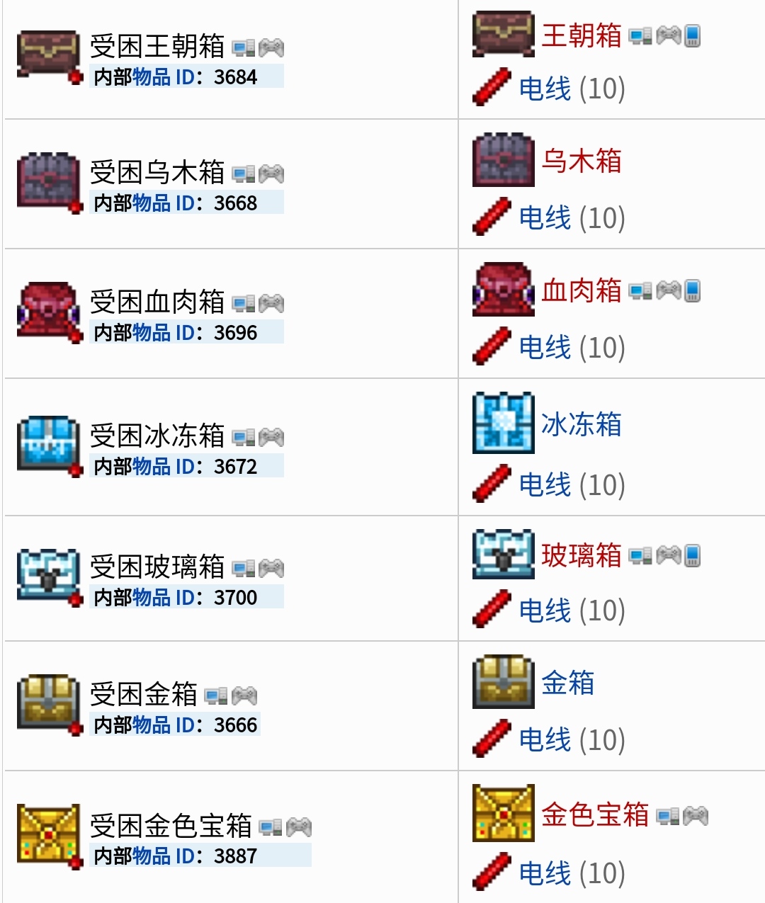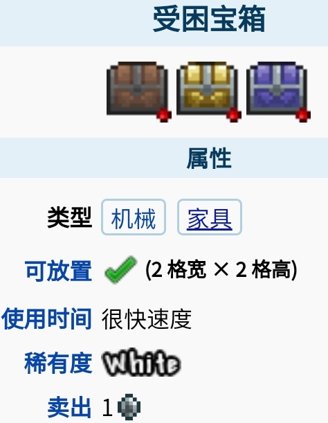 首頁 泰拉瑞亞 問答 泰拉瑞亞受困寶箱怎麼用? 2022-10-23 受困寶箱是一種具有普通寶箱外觀的機械物品,它不能用於收納,因為它並沒有任何收納欄。當它被打開時,它會發出信號,並可以用電線連接到電路中。任何寶箱都可以在重型工作台處用想要的寶箱和 10 個電線製作成相應的受困寶箱。