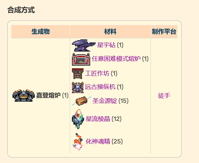 嘉登熔爐是一個月球領主後可以製造的製作站,用來製造「超級」物品。它算作工作台、困難模式的熔爐、星宇砧、工匠作坊、桌子、椅子、遠古操縱機和祭壇。 合成嘉登熔爐我們需要星宇砧 (1)、任意困難模式熔爐 (1)、工匠作坊 (1)、遠古操縱機 (1)、聖金源錠 (15)、星流棱晶 (12)、化神魂精 (25),徒手製作即可。