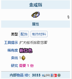 首頁 泰拉瑞亞 問答 泰拉瑞亞金戒指怎麼得? 2022-10-24 金戒指是一種在困難模式下,由海盜入侵時除鸚鵡外的敵怪所掉落的稀有配飾。海盜船長的掉率為0.4%,荷蘭飛盜船的掉率為2%;其餘敵人的掉率是0.1%。裝備金戒指可以增加玩家的錢幣拾取範圍,從2.5物塊,增加到半徑3物塊。