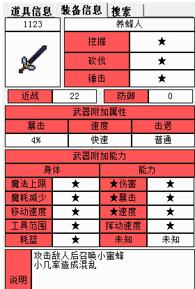 2.養蜂人是唯一一件可以施加混亂debuff的武器,召喚的蜜蜂可以多次穿透攻擊同一個敵人,蜜蜂在碰到液體或固體塊時可能會被毀壞。
