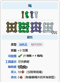 2.普通的繩子可以在寶箱和罐子當中找到,也可以進行購買。絲綢繩是用絲綢合成的。藤蔓繩是在裝備了植物纖維繩索寶典後摧毀藤蔓得到的。蛛絲繩是用蛛網進行製作的。