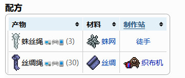 3.在4種繩子當中只有蛛絲繩還有絲綢繩可以進行合成,一個蛛網就可以製作出三個蛛絲繩,而一個絲綢在有織布機的地方可以製作出30個絲綢繩。