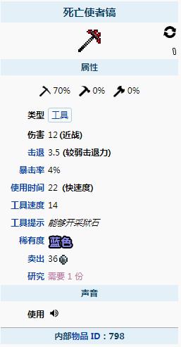泰拉瑞亞死亡代言人是指武器死亡使者鎬,屬於第五級別的鎬,可以用來挖掘大部分的物塊和礦石,死亡使者鎬可以用來在困難模式前挖掘黑檀石、猩紅石、黑曜石、獄石、沙漠化石以及地牢磚,最佳附魔是輕和傳奇。玩家可以用12個血腥錠和6個組織樣本在鐵砧上合成獲得。