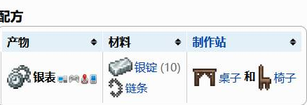 再泰拉瑞亞遊戲中銀表是製作而來的,製作銀表只需要10個鐵錠和一個鏈條就可以了,在製作站桌子加椅子處進行製作。如下圖所示: