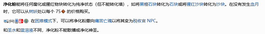 首頁 泰拉瑞亞 問答 泰拉瑞亞神聖粉末怎麼獲得? 2022-10-27 神聖粉末只能購買,不能製作,它是在束腰處以75個銅幣的價格購買,神聖粉末可以將腐化或者猩紅物塊轉化成純凈物塊,並且在困難模式後向痛苦亡魂拋灑神聖粉末,把它轉化成稅收官NPC。