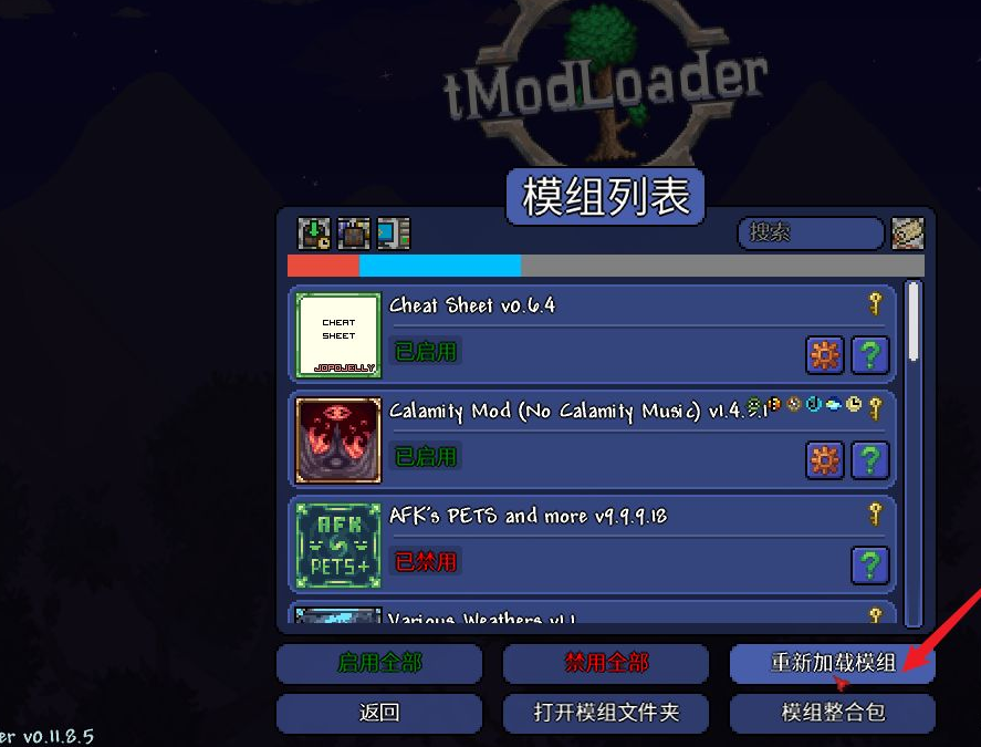 1.將災厄mod文件粘貼到mods文件夾,點擊tmodloader界面模組管理選項。
