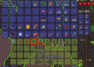 葉之翼翅膀:困難模式的配飾,玩家要獲得就需要擊敗蜂王。點開巫醫的「商店」,查看銷售頁面。找到葉之翼消費1鉑金點擊進行購買。