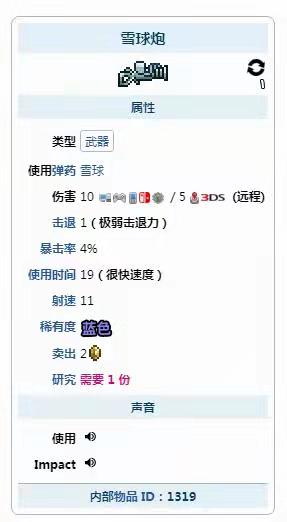 首頁 泰拉瑞亞 問答 泰拉瑞亞雪球炮怎麼合成? 2022-10-29 雪球炮介紹:在遊戲《泰拉瑞亞》中,雪球炮無法合成,只可以在地下雪原生物群落里的冰雪箱里找到,亦可在冰凍和針葉木匣中找到,炮彈為雪球,玩家可以在地圖上搜集雪塊,然後用雪塊來製作雪球給雪球炮補充彈藥。