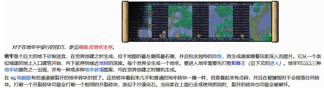 首頁 泰拉瑞亞 問答 泰拉瑞亞地牢走到一半沒路了怎麼辦? 2022-10-29 地牢並不會真的出現走到一半沒路的情況,那是因為地牢裡面有一些破碎的地牢磚塊,他的樣子幾乎和普通地牢磚塊一模一樣,不仔細看是發現不了的,玩家只需要用鎬子把它們敲掉相鄰的磚塊也會碎掉,然後就有路了。