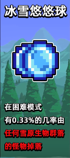 首頁 泰拉瑞亞 問答 泰拉瑞亞冰雪悠悠球怎麼獲得? 2022-10-29 泰拉瑞亞冰雪悠悠球是一款困難模式的悠悠球,有0.33%的幾率在雪原生物群落中的任何怪物身上掉落獲得,也可以從被腐化/猩紅化或被神聖化的雪原獲得。