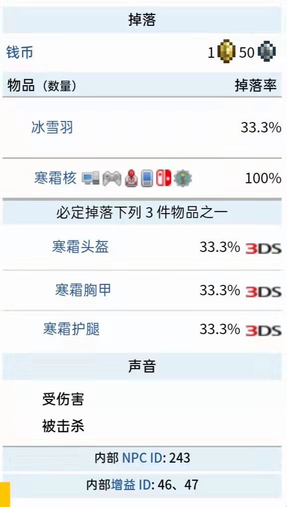 首頁 泰拉瑞亞 問答 泰拉瑞亞冰雪巨人會掉什麼? 2022-10-29 冰雪巨人掉落物介紹:在遊戲《泰拉瑞亞》,中冰雪巨人會掉落1金幣50銀幣,33.3%幾率掉落冰雪羽、100%幾率掉落寒霜核,然後必定掉落寒霜頭盔、寒霜胸甲、寒霜護腿三件物品之一。