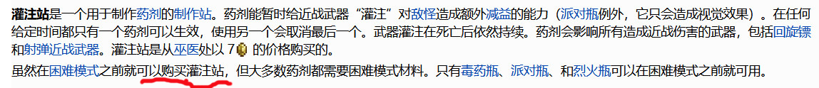 泰拉瑞亞灌注站不是通過製作獲得的,也就是不能合成,它是只能通過購買獲得,玩家並沒有辦法製作灌注站,玩家可以在巫醫處用7個金幣的價格購買灌注站,它是一個用於製作葯劑的製作站,能夠用來對敵怪造成額外的減益狀態,不過它僅對近戰的玩家有效,因為它的增益只能影響近戰武器。