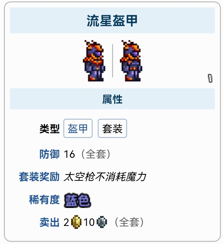 隕石盔甲更好,暗影盔甲能夠提供19點防禦力提高15%的移動速度,隕石盔甲能提供16點防禦力,使用太空槍時不消耗魔力。看上去暗影盔甲提高的屬性似乎更好一點,但事實上隕石盔甲讓太空槍不消耗魔力,大大提高了我們的遠程攻擊手段,所以隕石盔甲會更好。