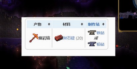 1、在泰拉瑞亞遊戲中熔岩刀即為熔岩鎬,合成可以獲得,首先需要獲取其材料,使用夢魘稿等65%鎬力以上的稿在地獄挖礦獲得獄石,水和熔岩作用生成黑曜石物塊,採集其可獲得黑曜石,將黑曜石和3個獄石在地獄熔爐製作可以獲得獄石錠。