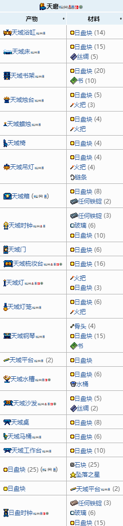 首頁 泰拉瑞亞 問答 泰拉瑞亞天磨可以干什麼? 2022-10-31 天磨是泰拉瑞亞中的製作站之一,可以從天域箱中找到,也能從蒸汽朋克人處購買獲得。天磨可用於製作各種天空主題的物品和傢具,具體配方如圖所示。