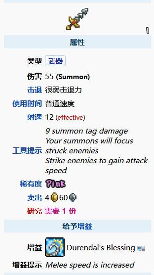 聖劍杜蘭德爾它的作用是擊中怪物後會讓召喚物集中攻擊到擊中的怪物上,一般是在打boss的時候使用打boss一下切換其他武器攻擊。屬性如圖: