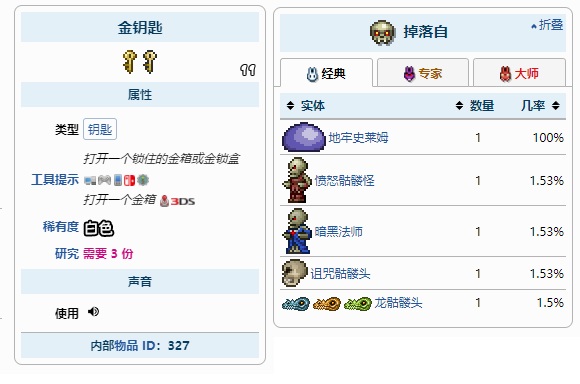 首頁 泰拉瑞亞 問答 泰拉瑞亞鑰匙掉落概率是多少? 2022-10-31 在遊戲《泰拉瑞亞》中,金鑰匙能夠打開地牢中的鎖住的金箱和在地牢釣魚所得到的金鎖盒,金鑰匙的掉落概率為100%由地牢史萊姆掉落,1.53%的概率由憤怒骷髏頭和暗黑法師和詛咒骷髏頭掉落,1.5%的概率由龍骷髏頭掉落。