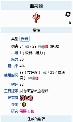 遊戲中血荊棘是一種困難模式魔法武器,有1/8 (12.5%)的幾率掉落於血漿哥布林鯊魚,使用時可召喚尖利的血荊棘射彈進行攻擊。