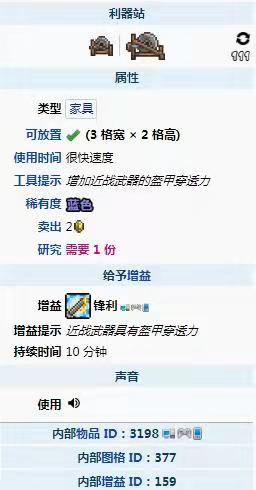 首頁 泰拉瑞亞 問答 泰拉瑞亞利器站在哪買? 2022-10-31 利器站獲取方法介紹:在遊戲《泰拉瑞亞》中,利器站獲得方法是在地下叢林中的地下小屋內拾取獲得,是一種傢具物品,放置下來並右鍵點擊後會為所有近戰武器應用鋒利增益,這個效果會持續10分鍾。