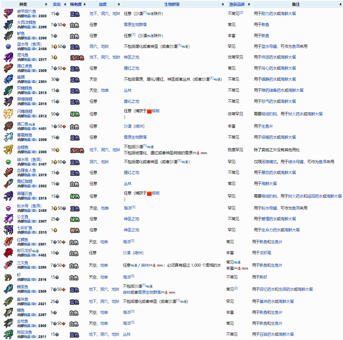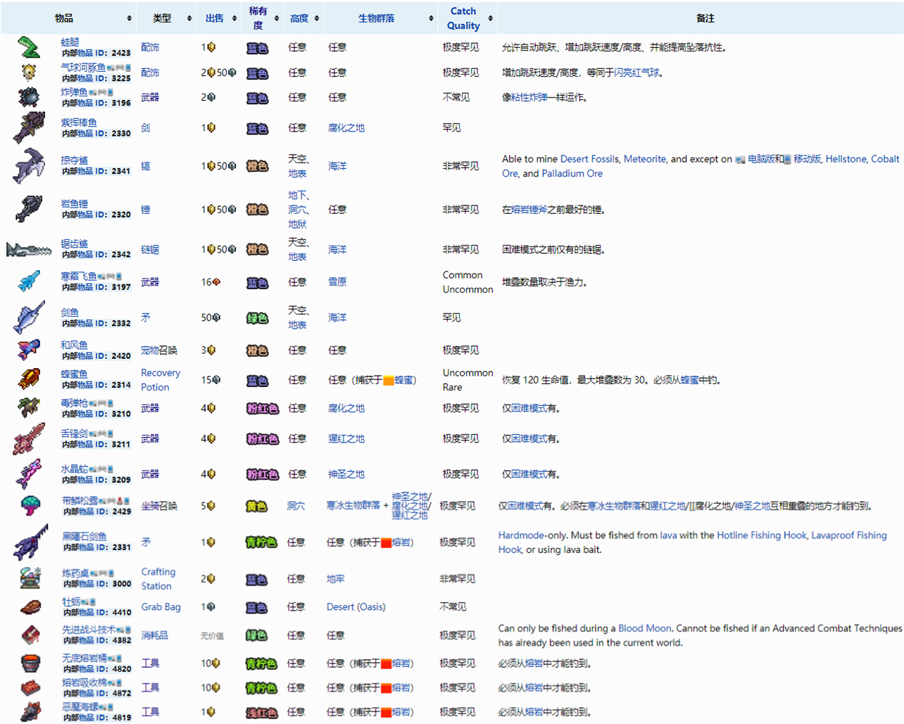 首頁 泰拉瑞亞 問答 泰拉瑞亞天空湖能釣上來什麼? 2022-10-31 有時候釣上來的不僅僅是魚,還有各種寶箱亦或是垃圾物品。1、魚類和任務魚:大多數可作為製作材料。2、可使用物品:大部分是工具或者武器。3、寶匣:開啟後隨機出藥水、魚餌。4、垃圾:沒有任何用途。