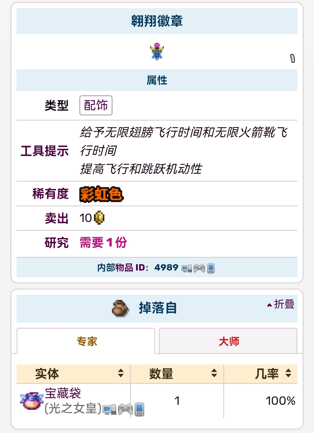 首頁 泰拉瑞亞 問答 泰拉瑞亞翱翔之證章怎麼獲得? 2022-10-31 翱翔徽章是一件困難模式 配飾,可從光之女皇的寶藏袋以 1/1 (100%) 的幾率獲得。它會提升跳躍高度和飛行時的上升速度,和蛙腿相似。它還會使翅膀或火箭靴獲得無限飛行時間。