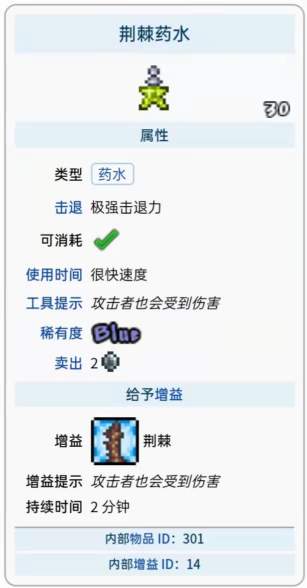 首頁 泰拉瑞亞 問答 泰拉瑞亞荊棘藥水怎麼做? 2022-11-01 荊棘葯水做法介紹:在遊戲《泰拉瑞亞》中,荊棘葯水製作所需材料為1水瓶、1死亡草、1仙人掌,是一種使用後賦予玩家荊棘增益的增益葯水,這個增益效果能擊退攻擊你的敵怪並且對敵怪造成它們所造成傷害 。