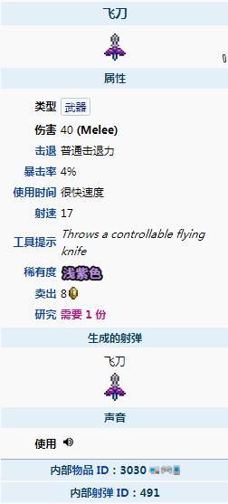 飛刀屬於困難模式的近戰武器,使用中會發出大量光,不穩定的移動可能會很難使用,像大多數穿刺武器一樣,對於多體節的敵怪非常有效。將滑鼠游標停留在飛刀和牆壁之間,它會試圖跟隨滑鼠游標持續從牆壁上反彈,獲得比開闊空間更高的每秒傷害。這在對抗毀滅者時極其有效。