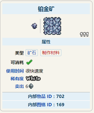 首頁 泰拉瑞亞 問答 泰拉瑞亞鉑金礦石長什麼樣? 2022-11-01 泰拉瑞亞鉑金礦石是亮灰色金屬,鉑金礦石呈現灰色固體狀,主要用於製作鉑金錠,後者用於製作第四級的裝備和一些其他的東西。鉑金礦有小幾率作為額外掉落掉落自史萊姆。