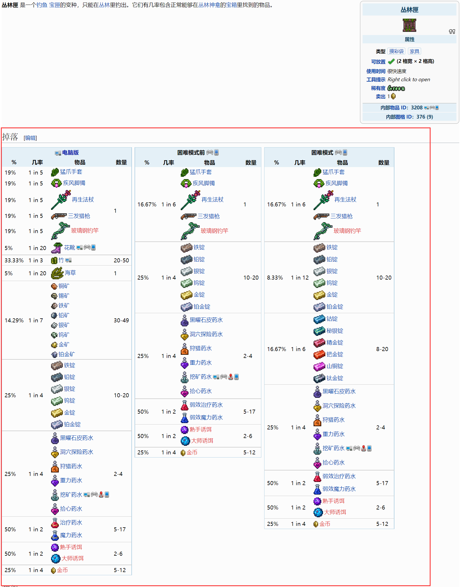 首頁 泰拉瑞亞 問答 泰拉瑞亞叢林匣能開出什麼? 2022-11-02 叢林匣能開出在叢林神龕的寶箱里找到的物品,如猛爪手套、疾風腳鐲、再生法杖、三發獵槍、玻璃鋼釣竿、黑曜石皮藥水、洞穴探險藥水、狩獵藥水、重力藥水和挖礦藥水等。