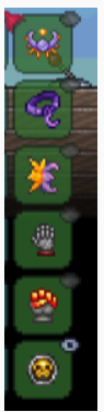 全屬性套裝(天體貝殼,天體石,月亮石),全屬性很厲害,新人一定請記住。10%全傷害,10%攻速,4護甲, 1回血,2%暴擊(還有挖掘與召喚物擊退,晚上變狼繼續提升)萬能飾品,如果不是追求pve走位玩家,全職業都推薦帶。機械手套,火焰手套 (又加傷害,又加攻速,都是我們需要的屬性)。最後一個格子帶個性價比高的飾品就行(攻速,傷害,暴擊都行)。6飾品到齊,下圖飾品僅供參考