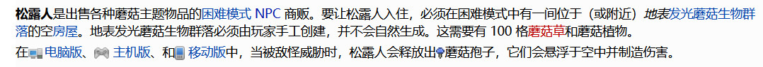 蘑菇人出現的條件是在困難模式之後,玩家在地表建立了地表發光蘑菇的生物群落,這個群落大小要超過100格,然後在這個生物群路附近製作一個可以容納蘑菇人的房子,並且這個房子不能被其他NPC占據,滿足了以上條件之後,蘑菇人就會自動生成在這個生物群落附近。