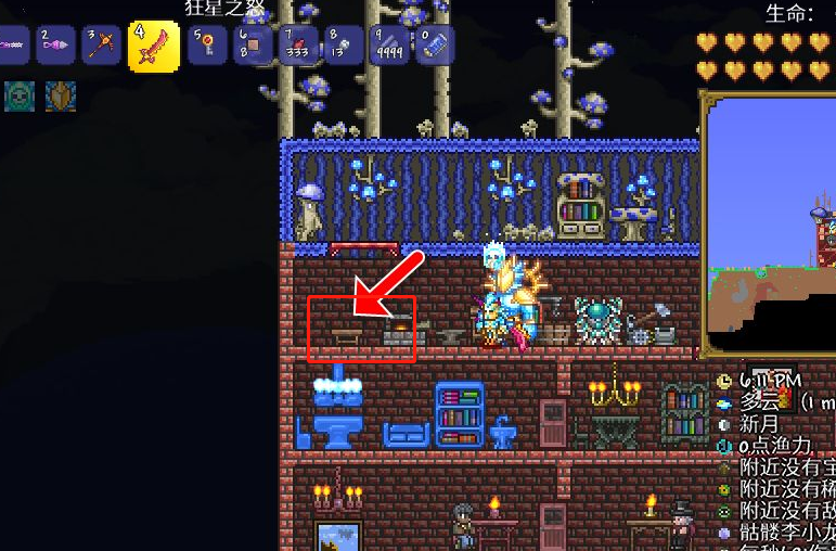 2.集齊60個骨頭後就可以在工作台上合成骨鞭了。如果暫時還打不過骷髏王的話可以在地下洞穴中探索,有的箱子里會出現骨頭,地下也可能刷骷髏。