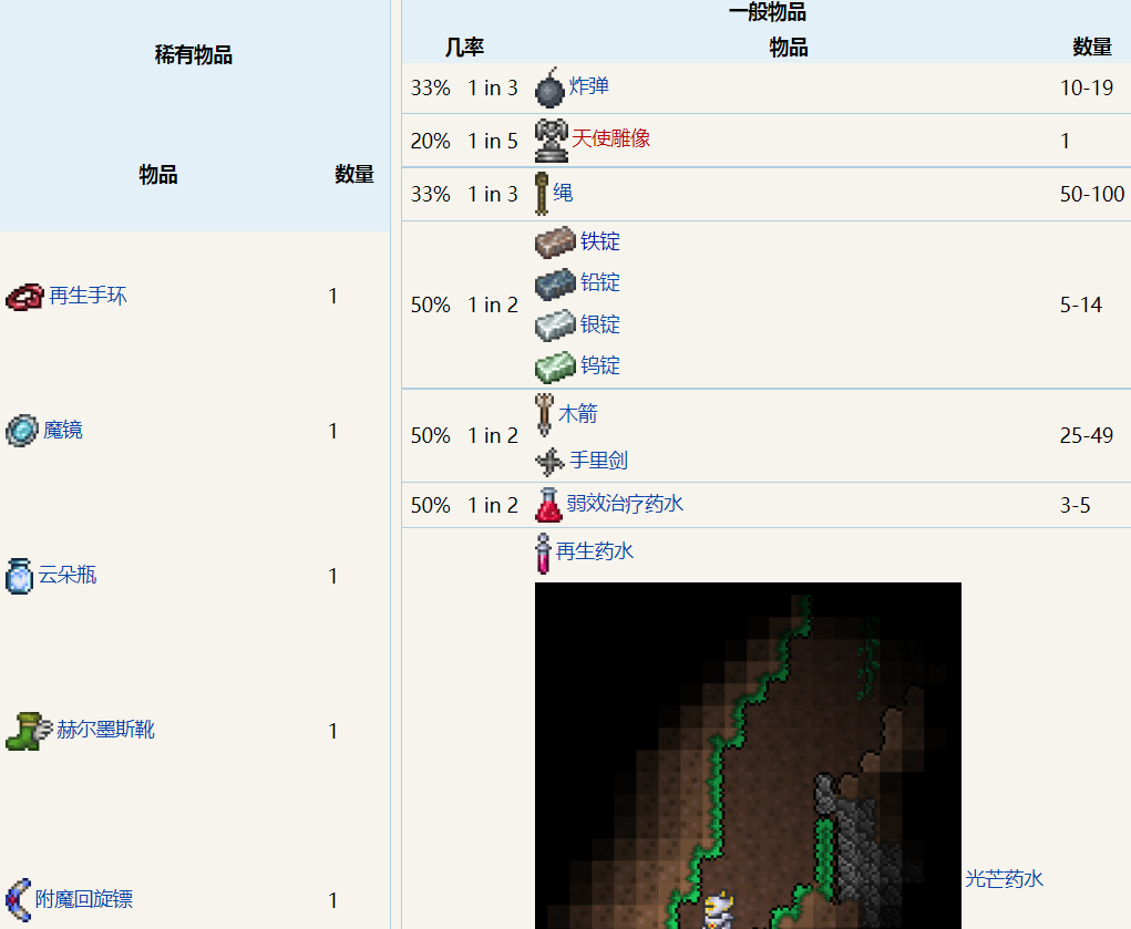 首頁 泰拉瑞亞 問答 泰拉瑞亞金箱子可以開出什麼? 2022-11-02 泰拉瑞亞金箱子可以開出再生手環、魔鏡、雲朵瓶、赫爾墨斯靴等等,具體如下。天然箱子內不會出現由當前世界內無法開採到的礦物所製成的錠 。例如,該世界沒有鐵礦,則箱子內不會生成鐵錠。