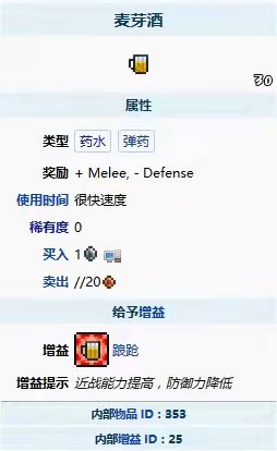 首頁 泰拉瑞亞 問答 泰拉瑞亞麥芽酒怎麼合成? 2022-11-02 麥芽酒合成方法:在遊戲《泰拉瑞亞》中,麥芽酒是在酒桶邊上使用1個玻璃杯,即可獲得1個麥芽酒。麥芽酒歸屬於增益類藥水一類,玩家使用麥芽酒後,可短期內提高近戰能力,降低防禦力,可以持續2分鍾。