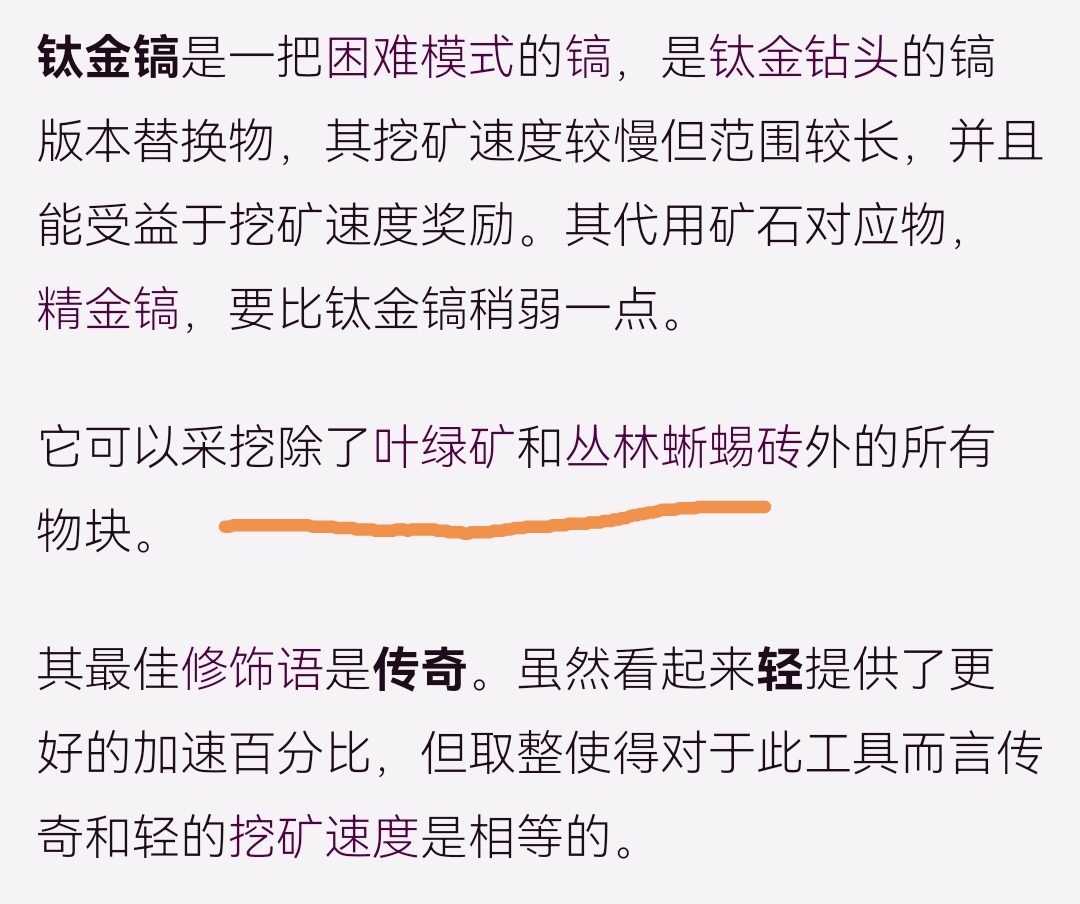 首頁 泰拉瑞亞 問答 泰拉瑞亞鈦金鎬能挖葉綠嗎? 2022-11-02 不能,鈦金鎬不能夠挖葉綠礦。鈦金鎬的鎬力只有190%,而挖葉綠礦需要的稿率至少是200%,鈦金鎬是達不到挖葉綠礦的要求的,所以它不能夠挖葉綠礦,但是它除了葉綠礦和叢林蜥蜴磚以外的所有礦物它都可以挖掉。