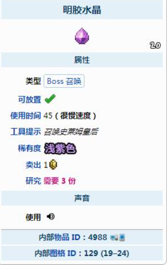 首頁 泰拉瑞亞 問答 泰拉瑞亞黏黏水晶怎麼合成? 2022-11-02 在遊戲《泰拉瑞亞》中,黏黏水晶的正式名稱為明膠水晶。它可以在地下神聖之地中的珍珠石或粉冰雪塊上找到。打破它時,它會掉落成為史萊姆皇後的召喚物品。只要玩家處於神聖之地中,它可以在任何時間、任何深度使用。
