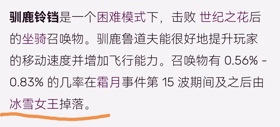 首頁 泰拉瑞亞 問答 泰拉瑞亞馴鹿鈴鐺怎麼得? 2022-11-03 馴鹿鈴鐺是一個困難模式下,擊敗 世紀之花後的坐騎召喚物。馴鹿魯道夫能很好地提升玩家的移動速度並增加飛行能力。召喚物有 0.56% - 0.83% 的幾率在霜月事件第 15 波期間及之後由冰雪女王掉落。