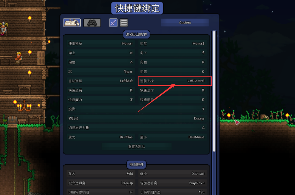 泰拉瑞亞遊戲中的黃色方框是智能游標,可以通過設置里設置為按鍵顯示。將智能游標由自動改為按鍵即可。默認的開關鍵是CTRL